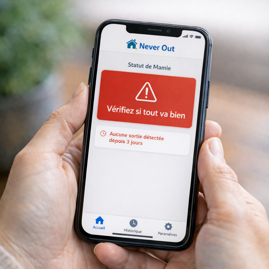 1 . Le boîtier Never Out détecte l’ouverture de la porte